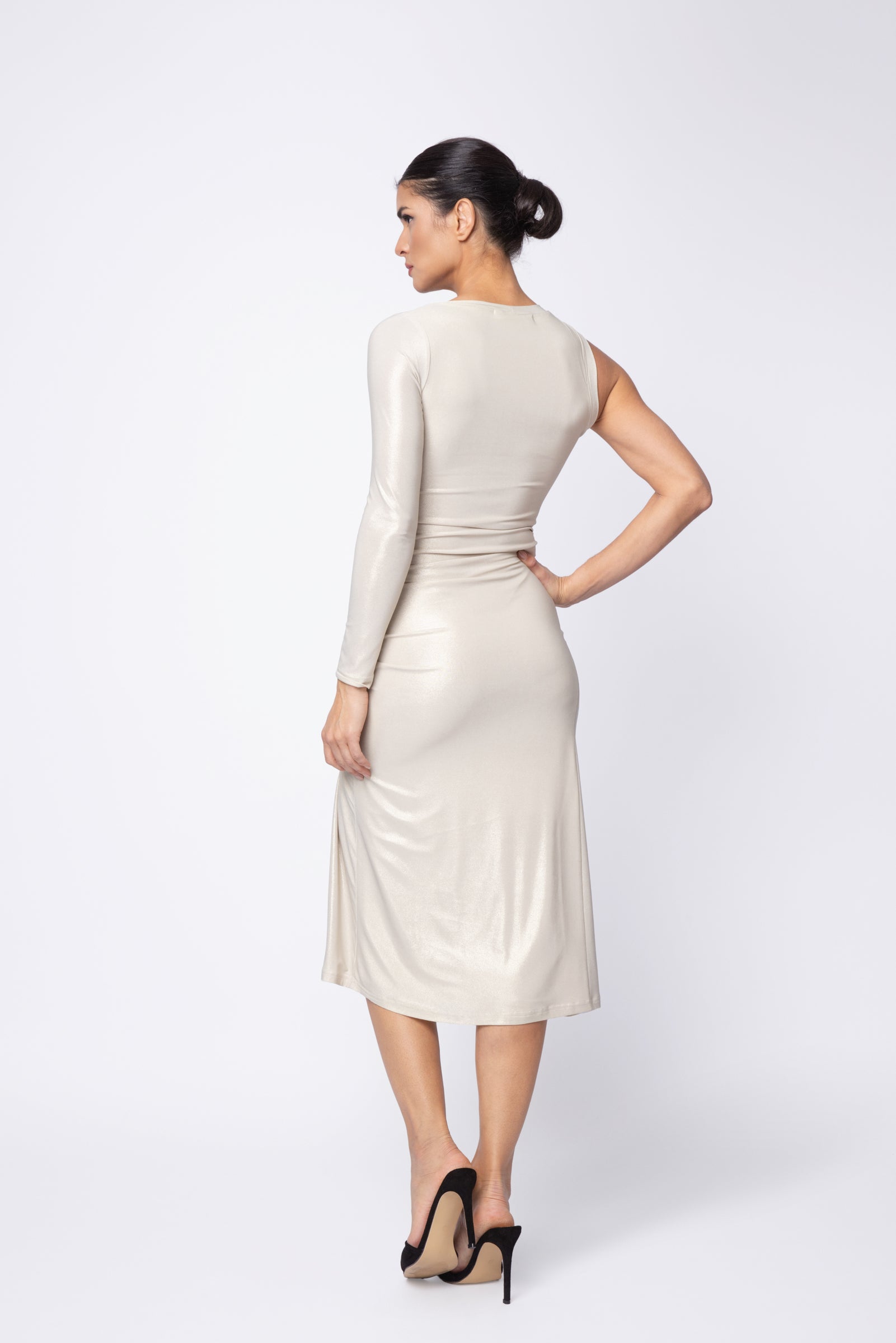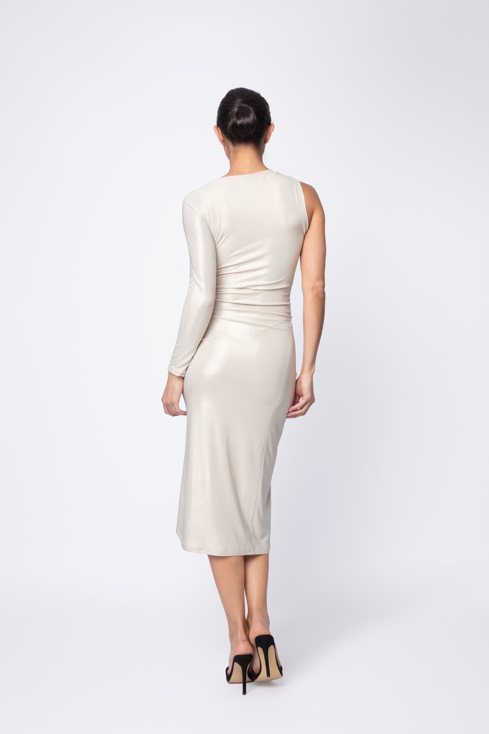 Cut from stretch jersey, the Hardware Dress is designed with a midi length, crew neckline, and A-line shape tailored to hug and flatter. Further enhanced by edgy hardware accents that create soft gathers, contouring the figure for a forgiving fit, this sleek one-sleeve asymmetrical silhouette achieves a look that reads effortlessly cool.