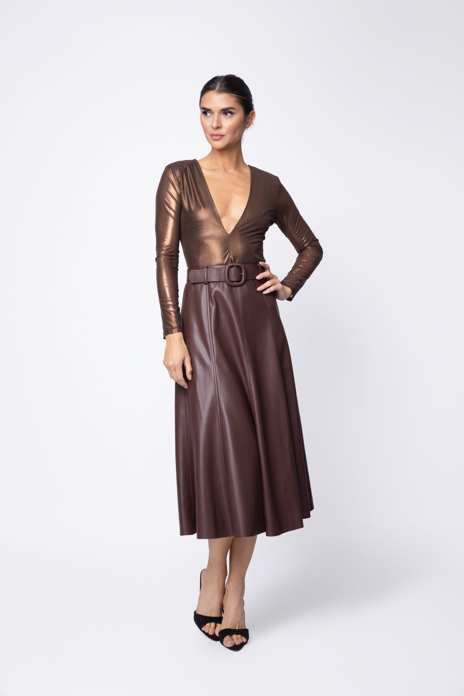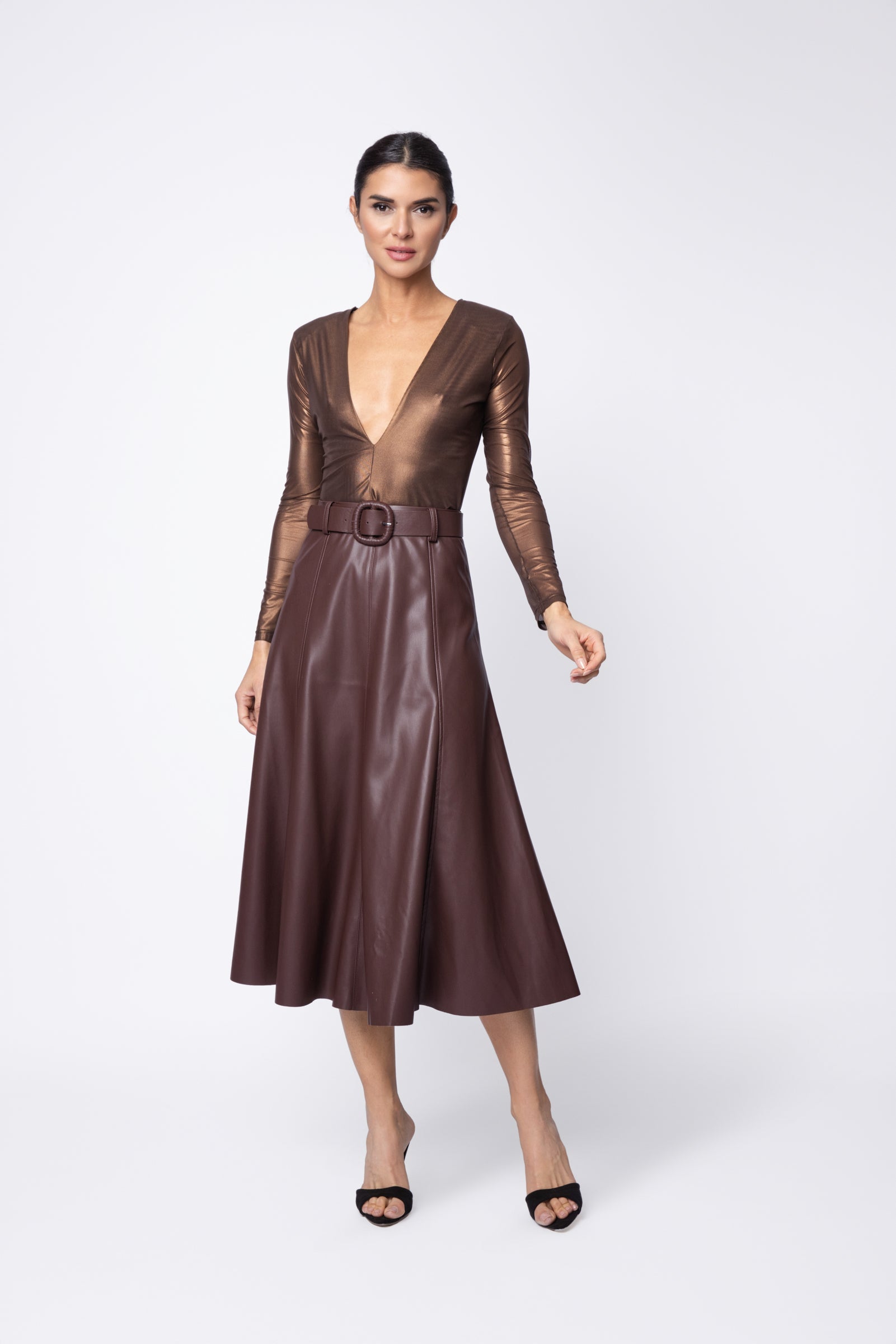 Designed with a flattering boot length and timeless A-line silhouette, this classic circle skirt is a wardrobe staple that offers endless outfit possibilities. Crafted from buttery vegan leather, it features paneled construction with topstitching and showcases a matching belt with leather-covered buckle for a waist-defining look.