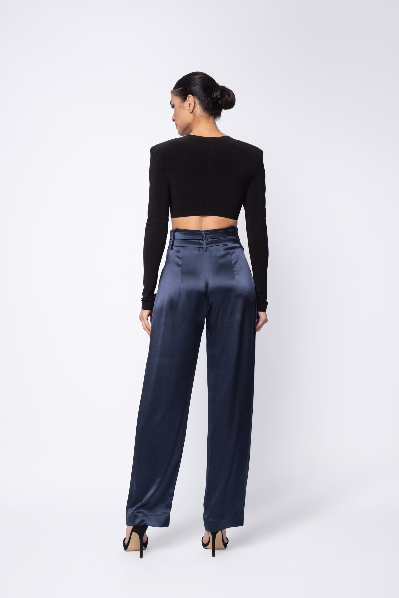 The high-waisted design, front pleats, and full-length, straight wide leg accentuate the waistline, creating a flattering elongated silhouette and elegant streamlined effect.