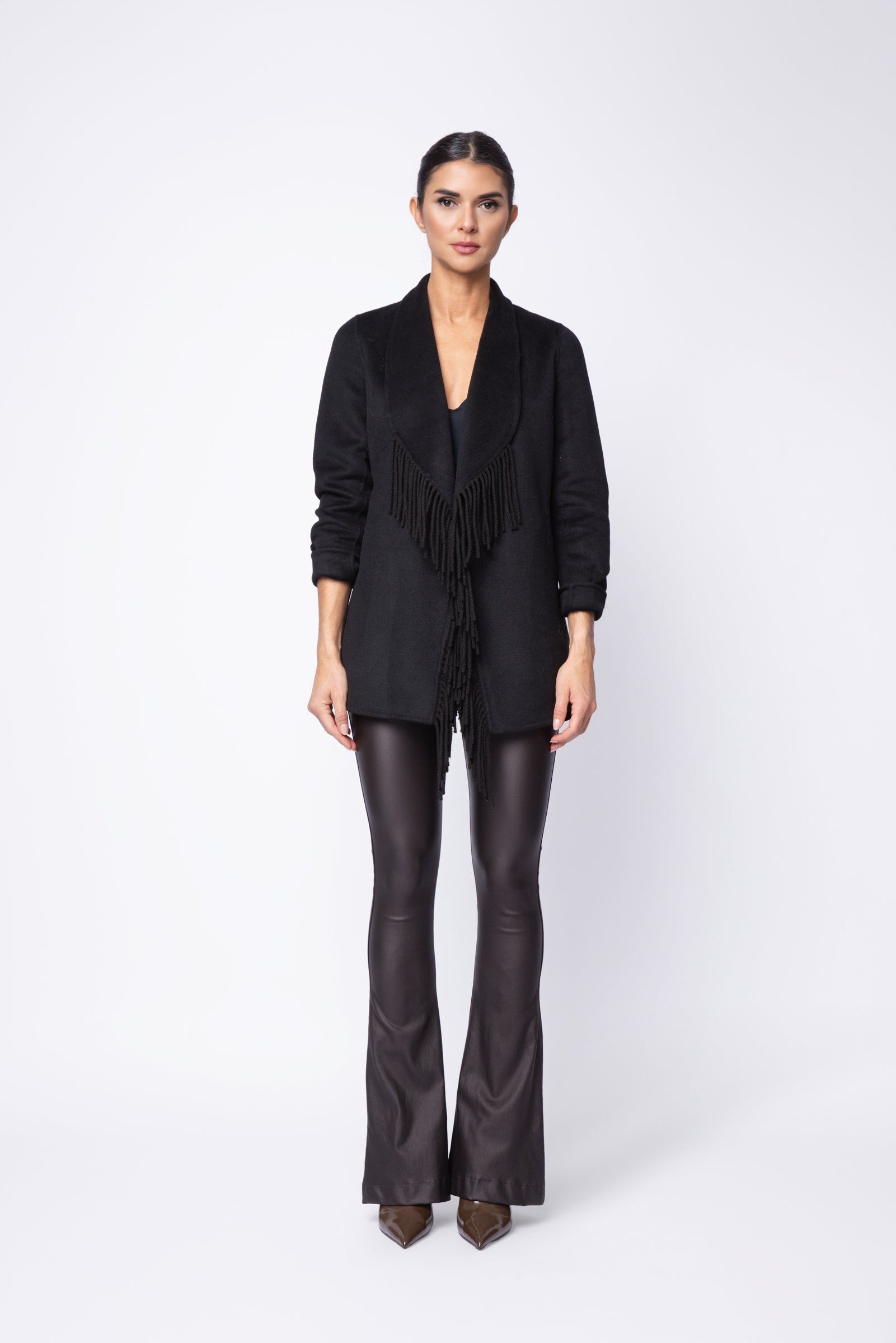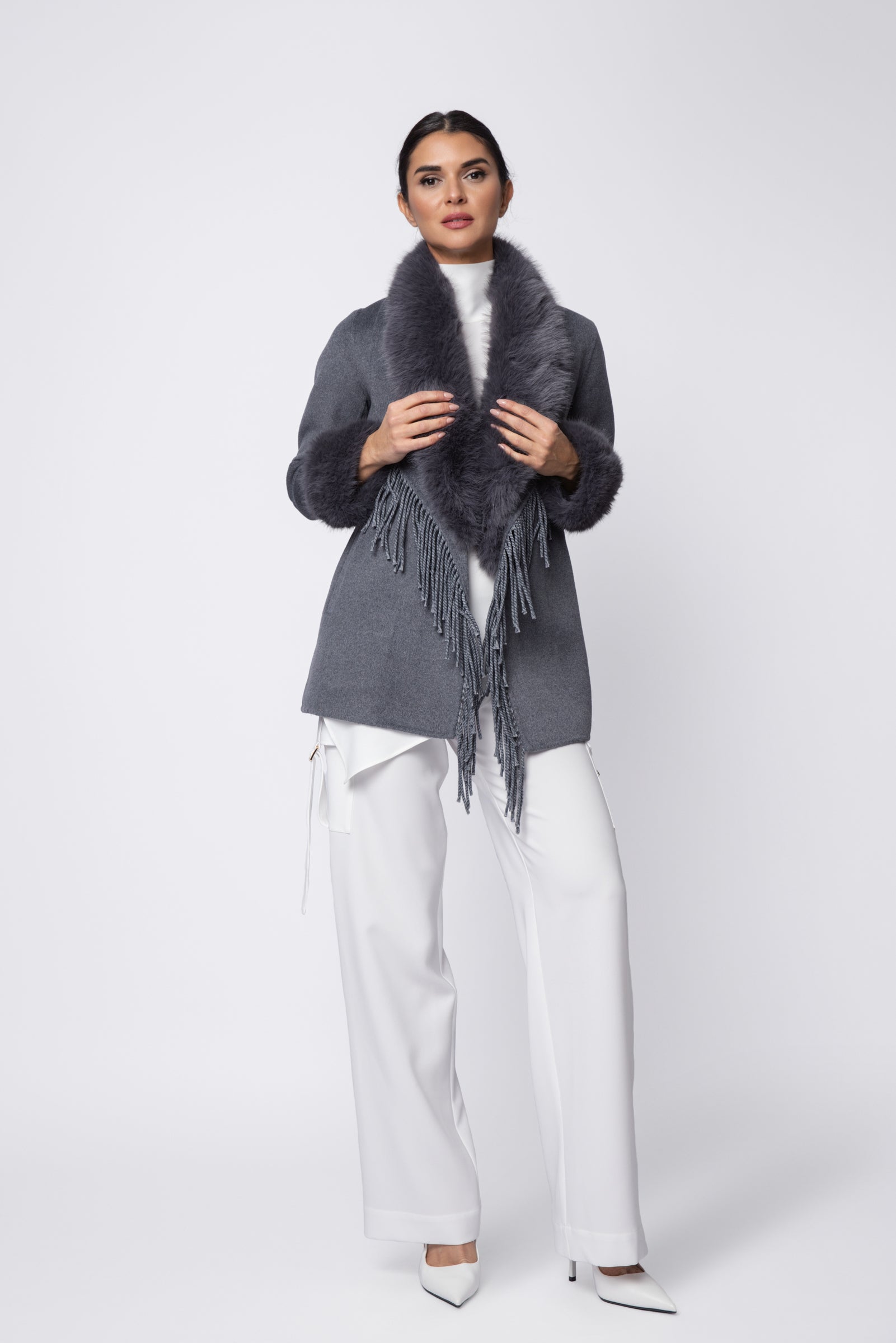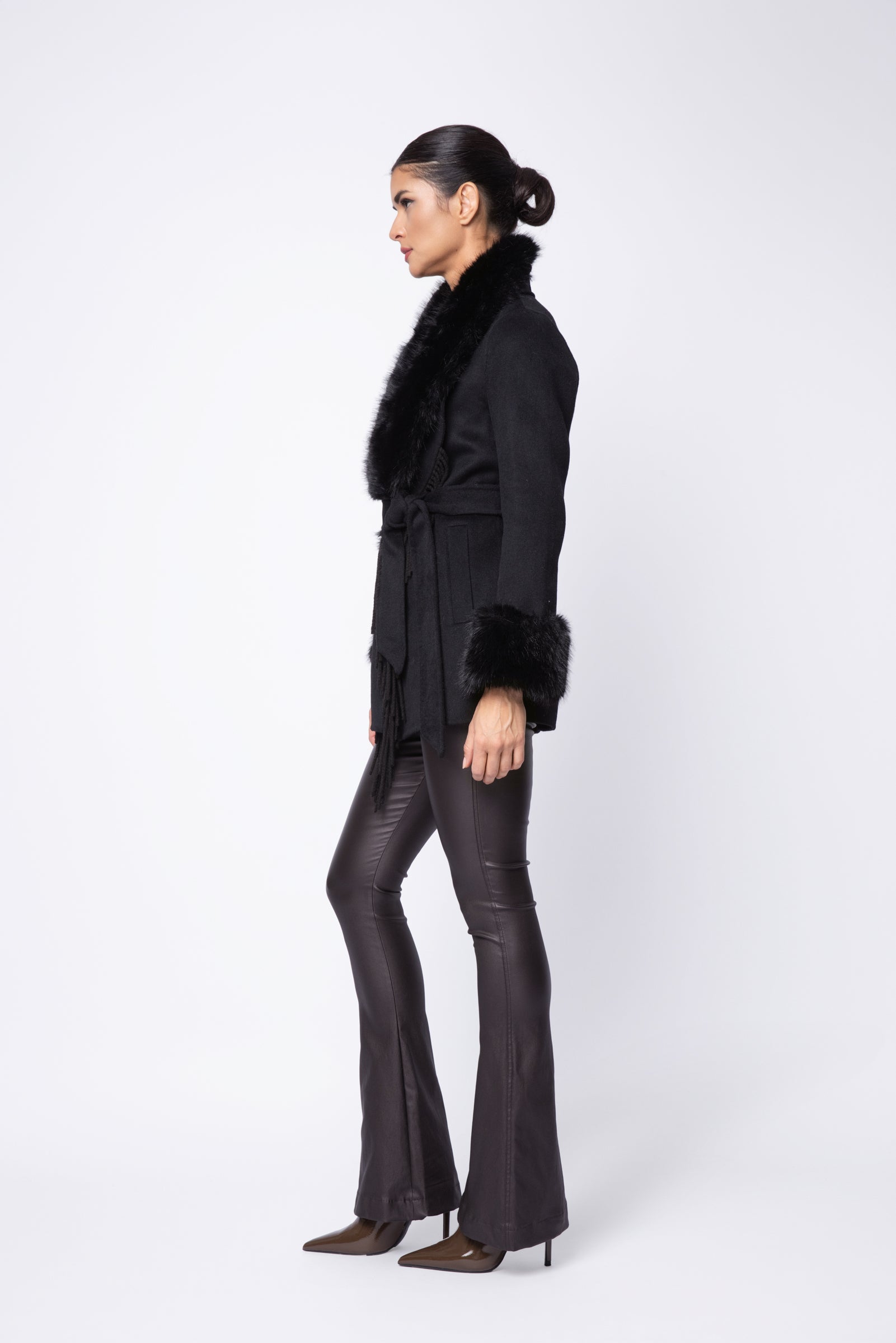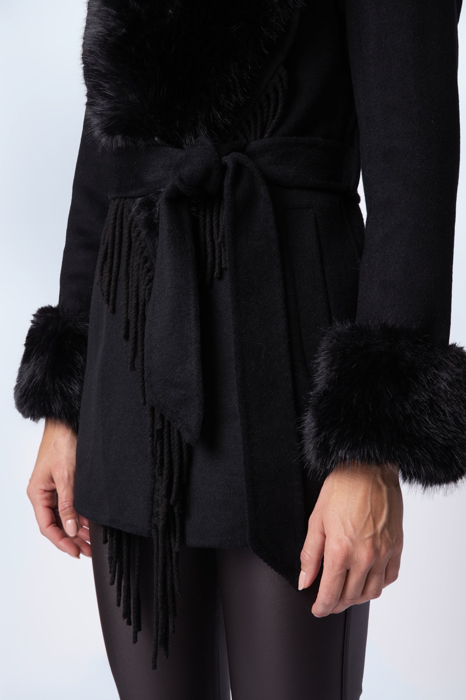 This soft yet structured wrap coat is crafted of an unlined double-faced wool blend in a relaxed fit, designed with an open front and self-tie belted closure for an adjustable silhouette. It features a fringe-trimmed shawl collar, side slip pockets, and button-on detachable faux-fur trim collar and cuffs.