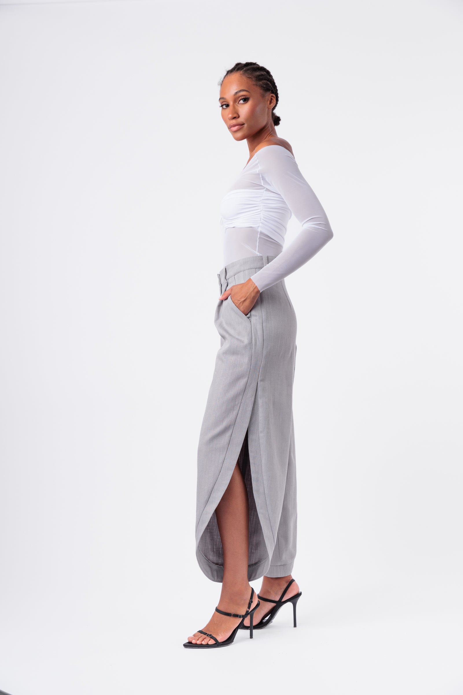 A new addition to the denim repertoire, these straight-fitting pants feature thigh-high side slits and dramatic curved hem.